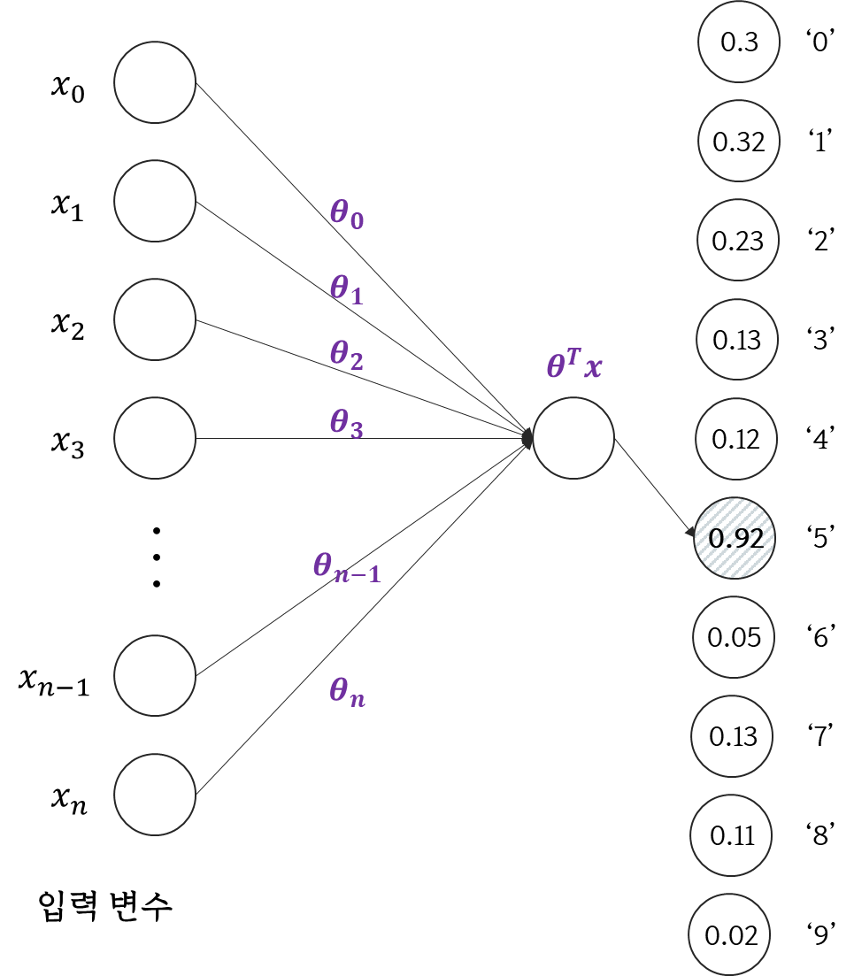 더 복잡한 과정이 있겠지만, 쉽게 설명했을 때, 세타값을 따라서 값이 나오고, 이 값을 0부터 9까지의 수 중에서 어디에 적합한지 판단을 하고 그 과정에서 가장 높은 값이 그 숫자라고 판단하는 것이다.
