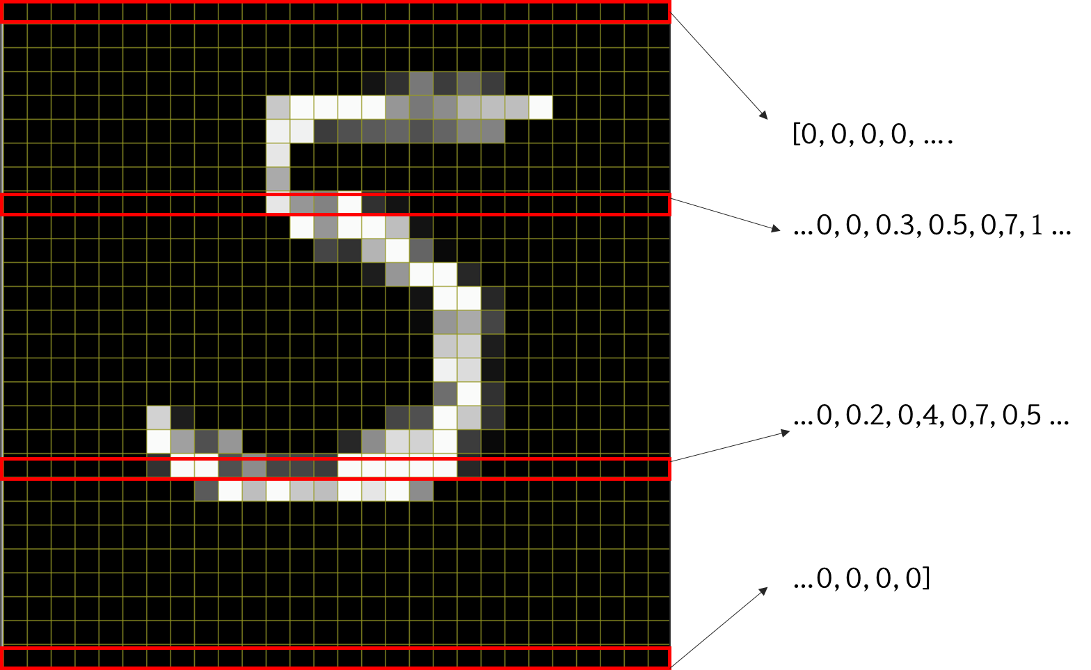 위의 그림처럼, 만약 픽셀이 검정색이면0, 흰색이라면 1일 경우 저렇게 한줄 한줄을 0~1 사이의 값으로 읽는다.