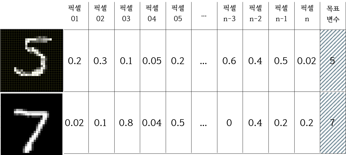 이런식으로 숫자그림(입력변수)의 픽셀 하나하나가 활용되는 것이다. 그리고 목표변수를 통해 숫자의 값을 학습을 시키는 것이다.