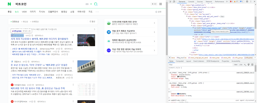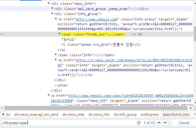 로 기관명을 충분히 갖고올 수 있다. 만약에 'info press'에 여러개의 span태그로 감싸져 있다면 몇번째 span인지 확인할 필요가 있고